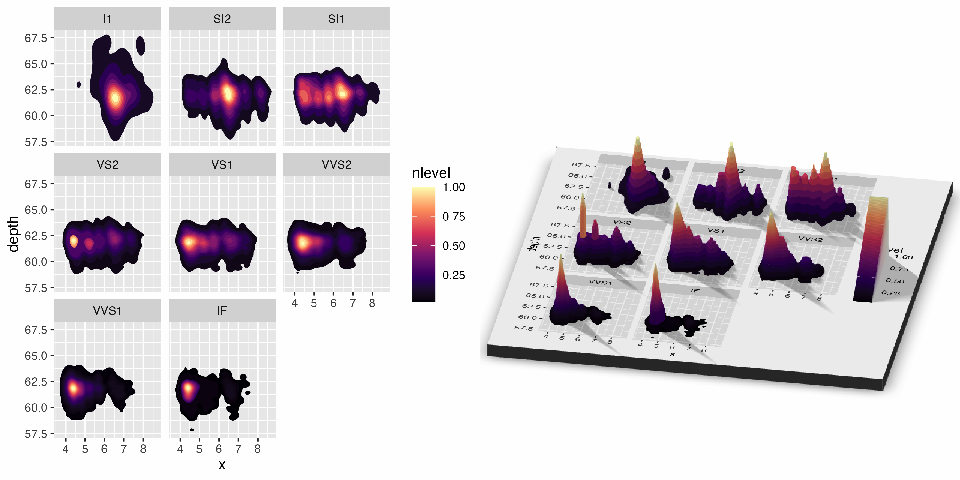 • plot_gg() Takes a ggplot2 object (or a list of two ggplot2 objects) and uses the fill or color aesthetic to transform the plot into a 3D surface. You can pass any of the arguments used to specify the camera and the background/shadow colors in plot_3d(), and manipulate the displayed 3D plot using render_camera() and render_depth().