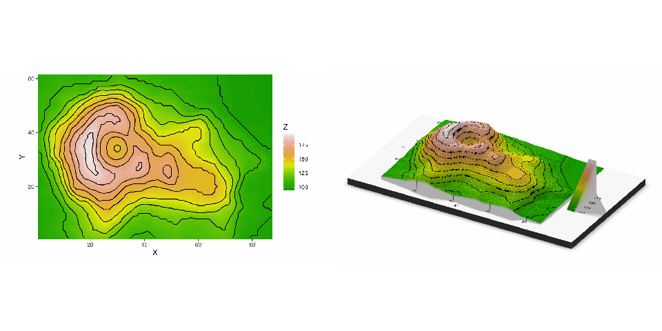 Rayshader will automatically ignore lines and other elements that should not be mapped to 3D. Here’s a contour plot of the volcano dataset.