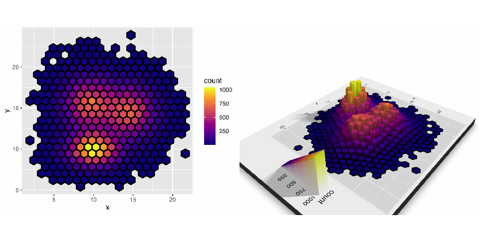 geom_hex(bins = 20, linewidth = 0.5, color = "black") +