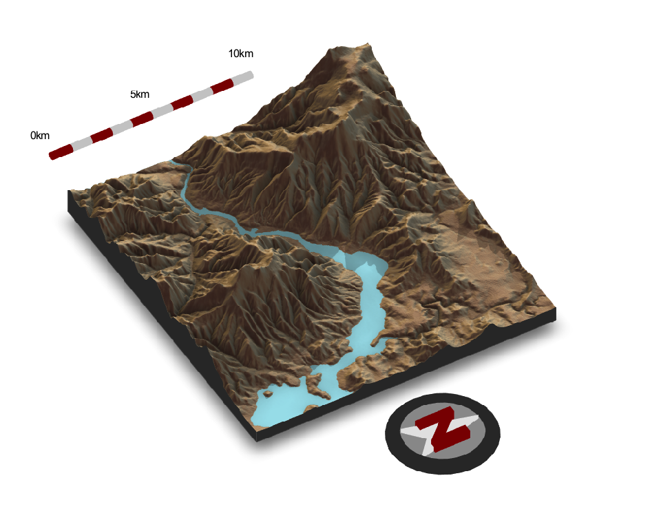 detect_water() uses a flood-fill algorithm to detect bodies of water of a user-specified minimum area.add_water() uses the output of detect_water to add a water color to the map. The user can input their own color, or pass the name of one of the pre-defined palettes from sphere_shade to get a matching hue.generate_altitude_overlay() uses a hillshade and the height map to generate a semi-transparent hillshade whose transparency varies with altitude.generate_compass_overlay() generates an overlay with a compass.generate_contour_overlay() calculates and returns an overlay of contour lines.generate_label_overlay() this uses the maptools::placeLabel() function to generate labels for the given scene. Either use an sf object or manually specify the x/y coordinates and label.generate_line_overlay() generates an overlay of lines, using an sf object with LINESTRING geometry.generate_point_overlay() generates an overlay of points, using an sf object with POINT geometry.generate_polygon_overlay() generates an overlay of points, using an sf object with POLYGON geometry.generate_scalebar_overlay() this function creates an overlay with a scale bar of a user-specified length. It uses the coordinates of the map (specified by passing an extent) and then creates a scale bar at a specified x/y proportion across the map. If the map is not projected (i.e. is in lat/long coordinates) this function will use the geosphere package to create a scale bar of the proper length.generate_waterline_overlay() generates a semi-transparent waterline overlay to layer onto an existing map using a height map or a boolean matrix.Also included are functions to add additional effects and information to your 3D visualizations: