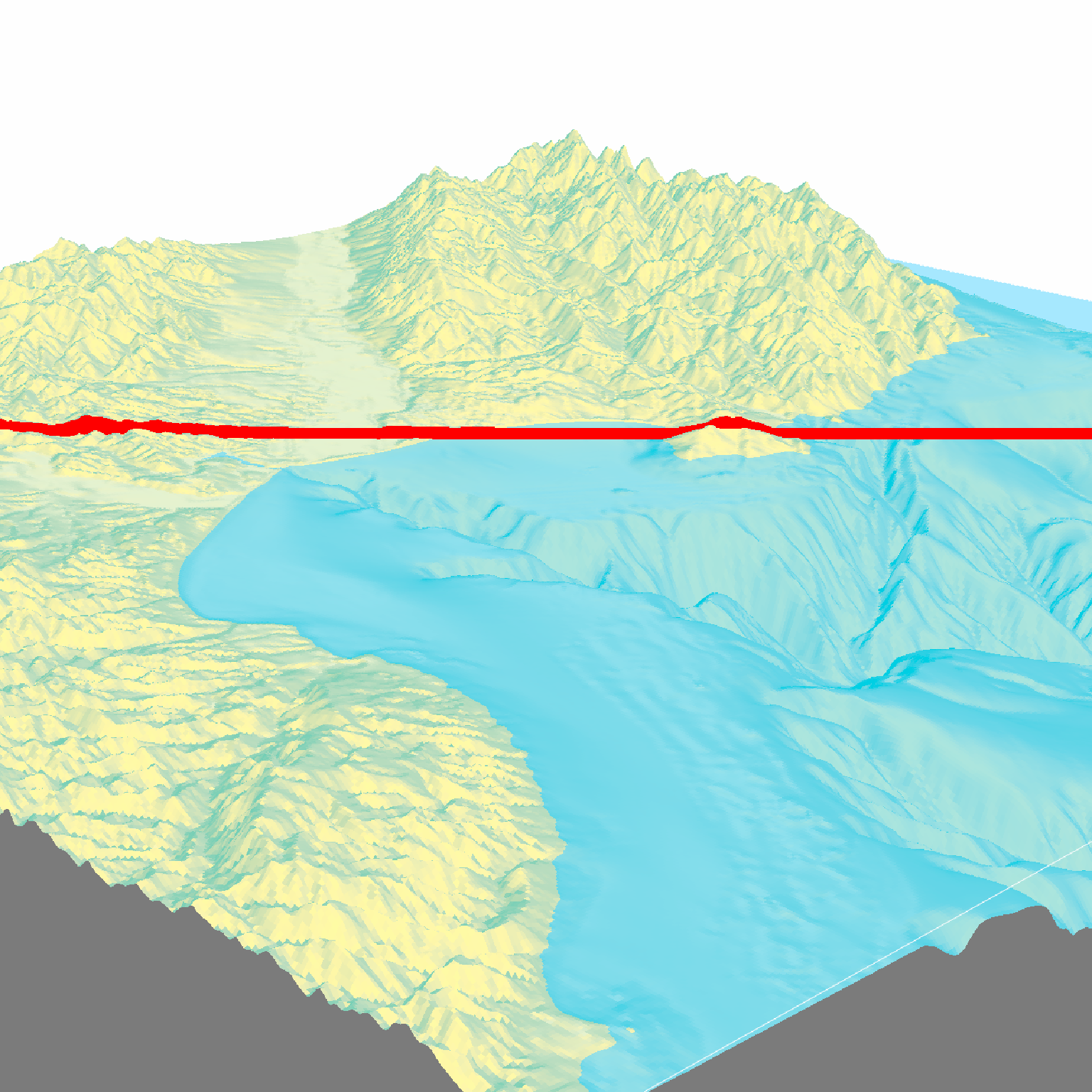 plot_3d(montereybay,zscale=50, water=TRUE, waterlinecolor="white",